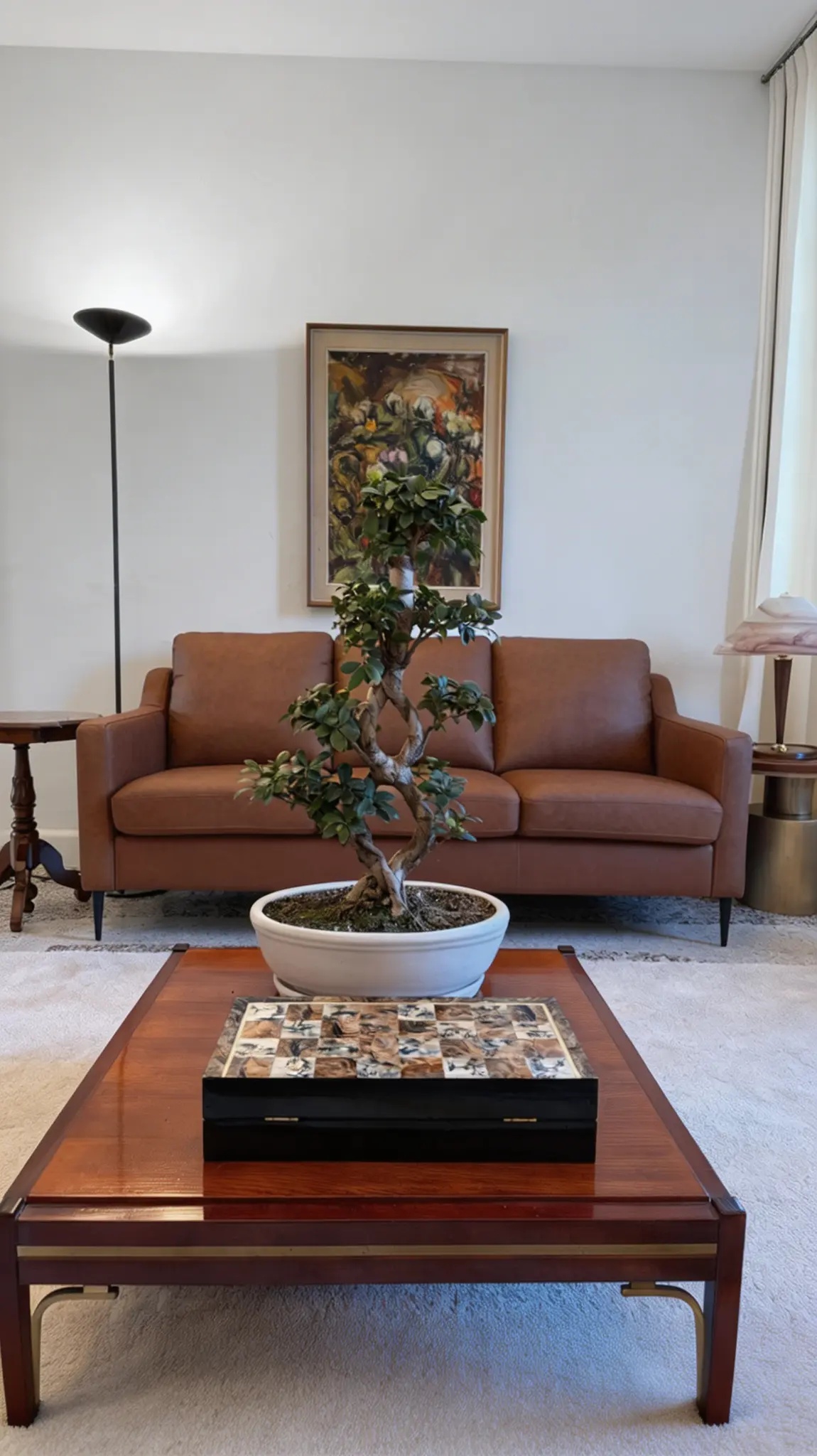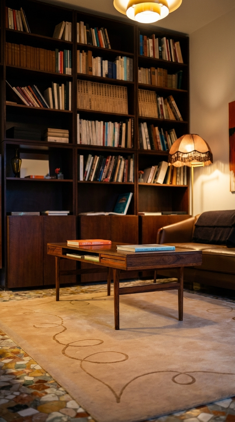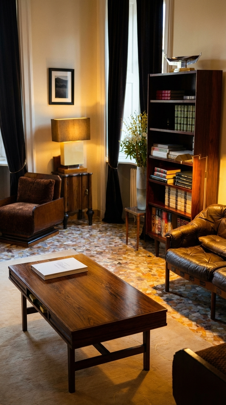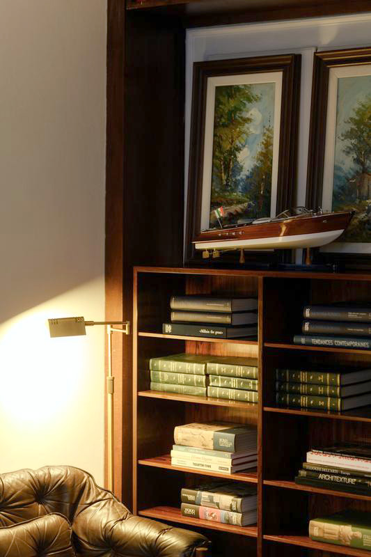 Floor-to-ceiling mahogany shelves, a marble coffee table, deep leather sofas.