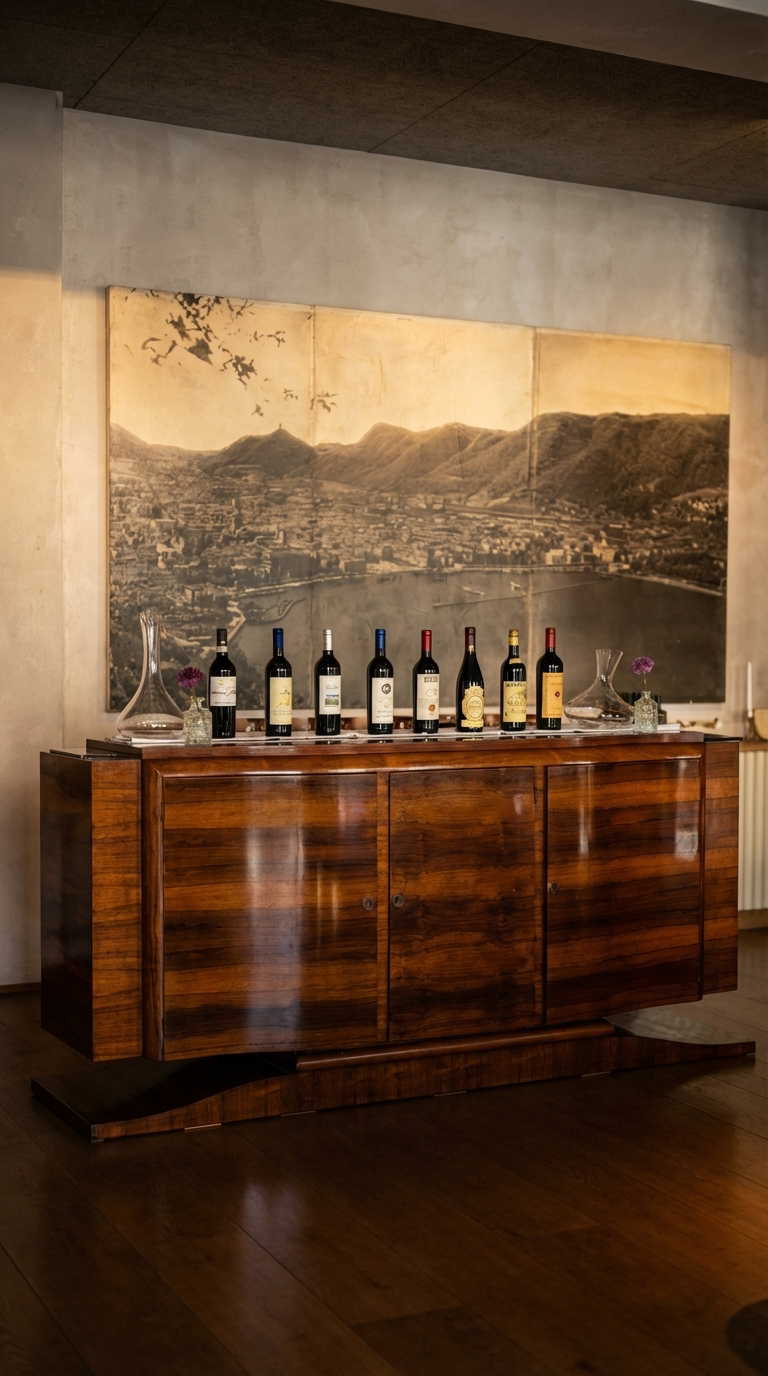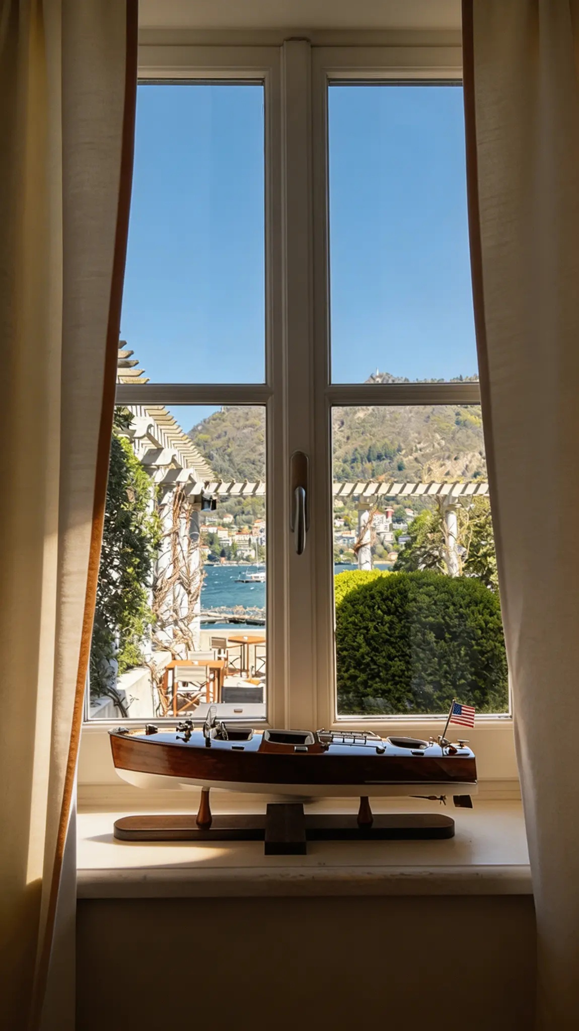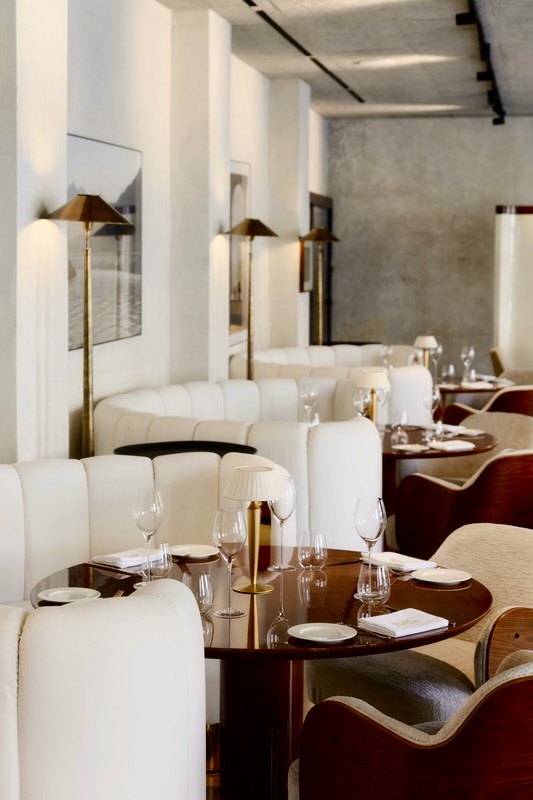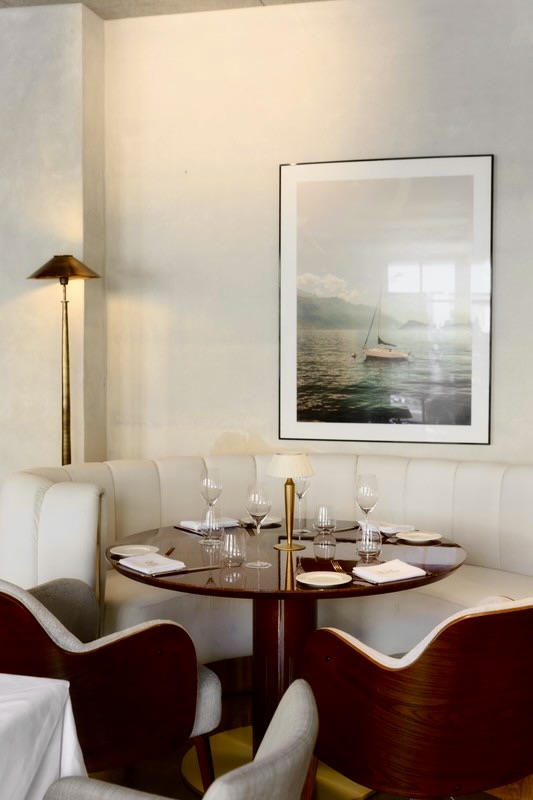 Long lunches and unhurried dinners in an intimate setting. Warm walnut, brass detailing, and Riva boat photography set the scene.